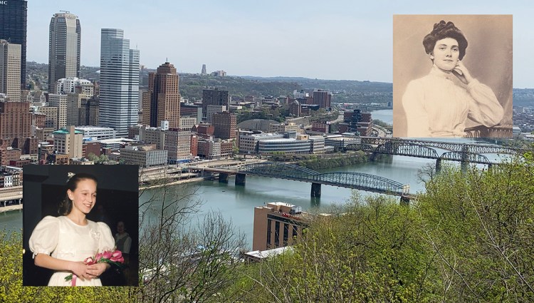 Recently we took a trip to Pittsburgh to visit my stepdaughter Katie and her husband Dave. We were so happy to see this place where the rest of their history will be written. In this post, I’ve written about Katie and Dave’s life to come in Pittsburgh, as well as visiting the place that was home for my father growing up, a place I had never been before. This tale is the beginning of the Reillys’ story in America. To read All Roads Lead to Pittsburgh, click here. The photo below was taken of the city from a spot not far from where my dad grew up and where Katie lives now. The insets are Katie and my grandmother, Annie O’Connor Reilly.